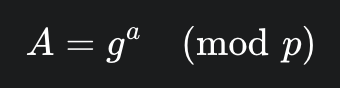 암호키를 교환하는 하나의 방법으로 밑의 식에서 g와 a와 p를 안다면 A는 구하기 쉽지만 g와 A와 p만 안다면 a를 구하기는 어렵다는 원리에 기반한 알고리즘입니다. 처음에 공개 값을 공유하고 각자의 비밀 값고 혼합한 후 혼합 값을 공유합니다. 그다음 각자의 비밀 값과 또 혼합합니다. 그 이후에 공통의 암호키인 PSK(Pre-Shared Key)가 생성됩니다. 이렇게 클라이언트와 서버 모두 개인키와 공개키를 생성하고, 서로에게 공개키를 보내고 공개키와 개인키를 결합하여 PSK가 생성된다면, 악의적인 공격자가 개인키 또는 공개키를 가지고도 PSK가 없기 때문에 아무것도 할 수 없습니다.